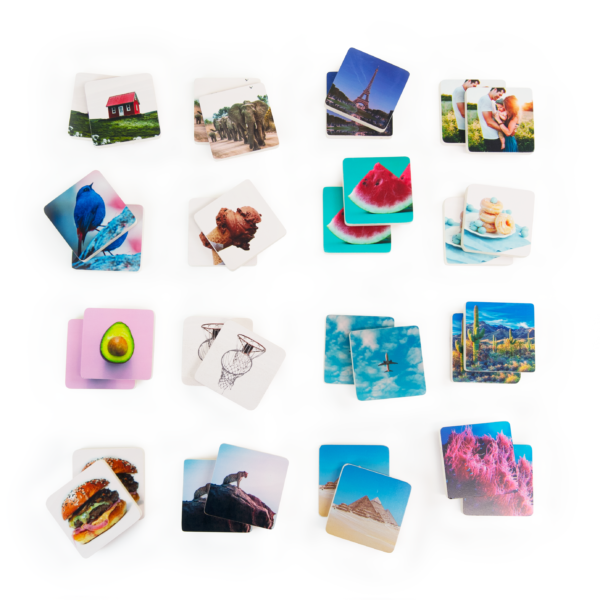 Preprosto vstavite eno od šestih tematskih šablon med dve leseni plošči, pokrijte slike s pikapolonicami in zabava se lahko začne. Otroci ne bodo urili le spomina, temveč tudi fino motoriko, logično razmišljanje in širili besedni zaklad. Igra je idealna za samostojno igranje ali preživljanje časa z družino. Igra vključuje 6 tematskih kart. Na eni kartici je sadje, na drugi geometrijski liki, na tretji domače živali, na četrti živali v živalskem vrtu, na peti so načini prevoza, na zadnji, šesti karti pa so pisane lise z angleškimi imeni barv.