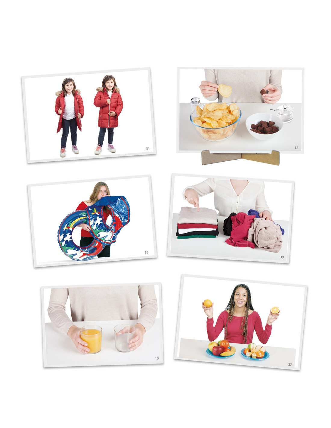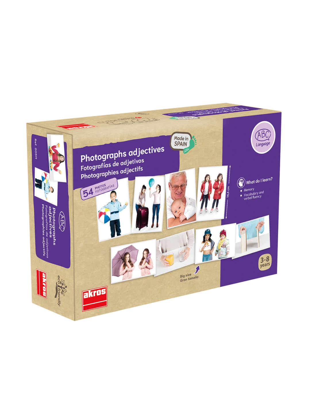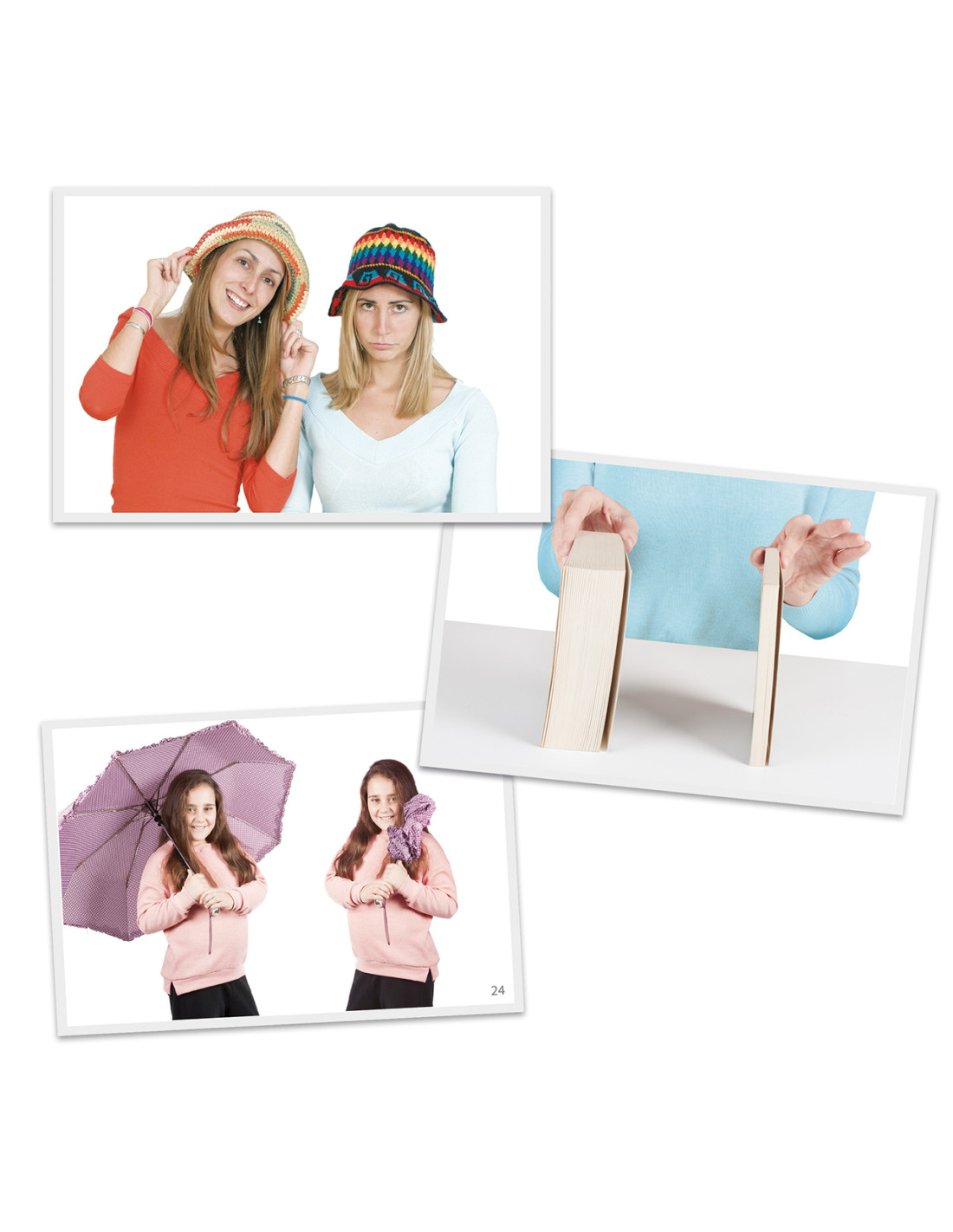 54 fotografij (16,6 x 11,6 cm), ki predstavljajo osnovne pridevnike. Priloženo držalo za fotografije.