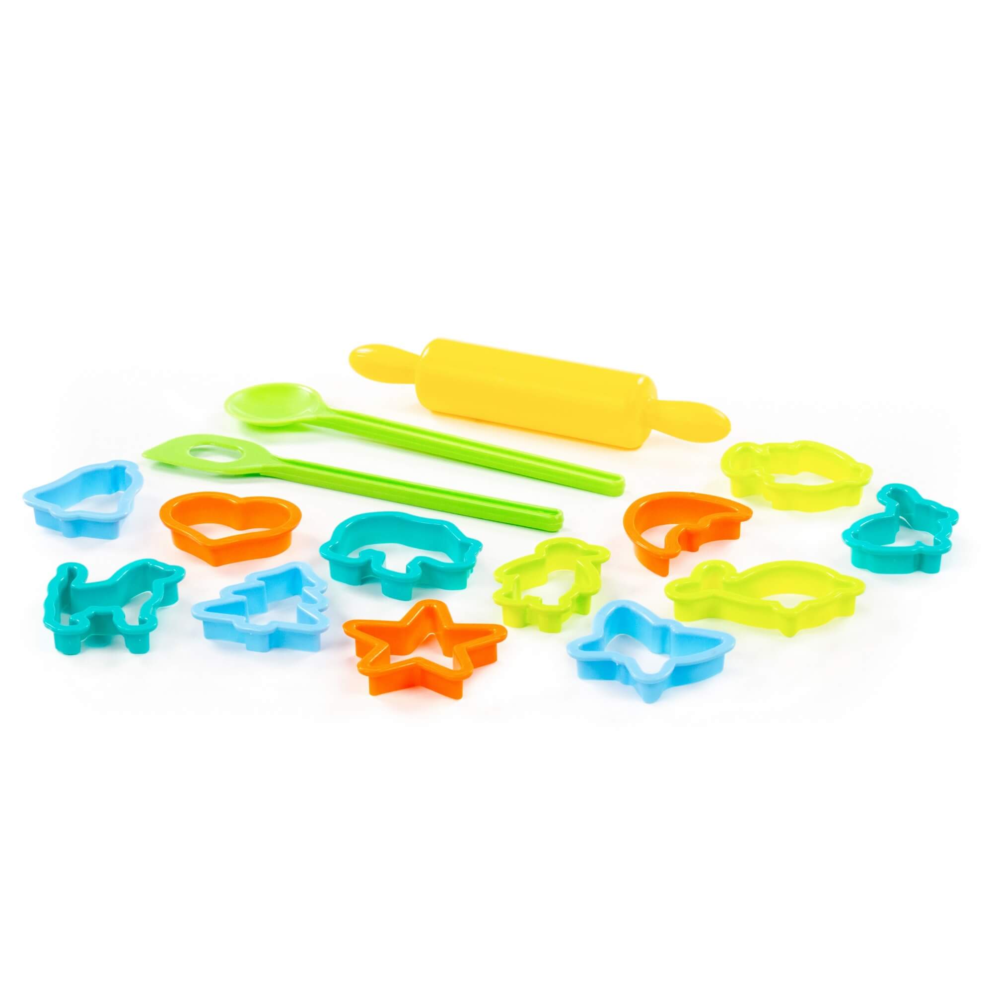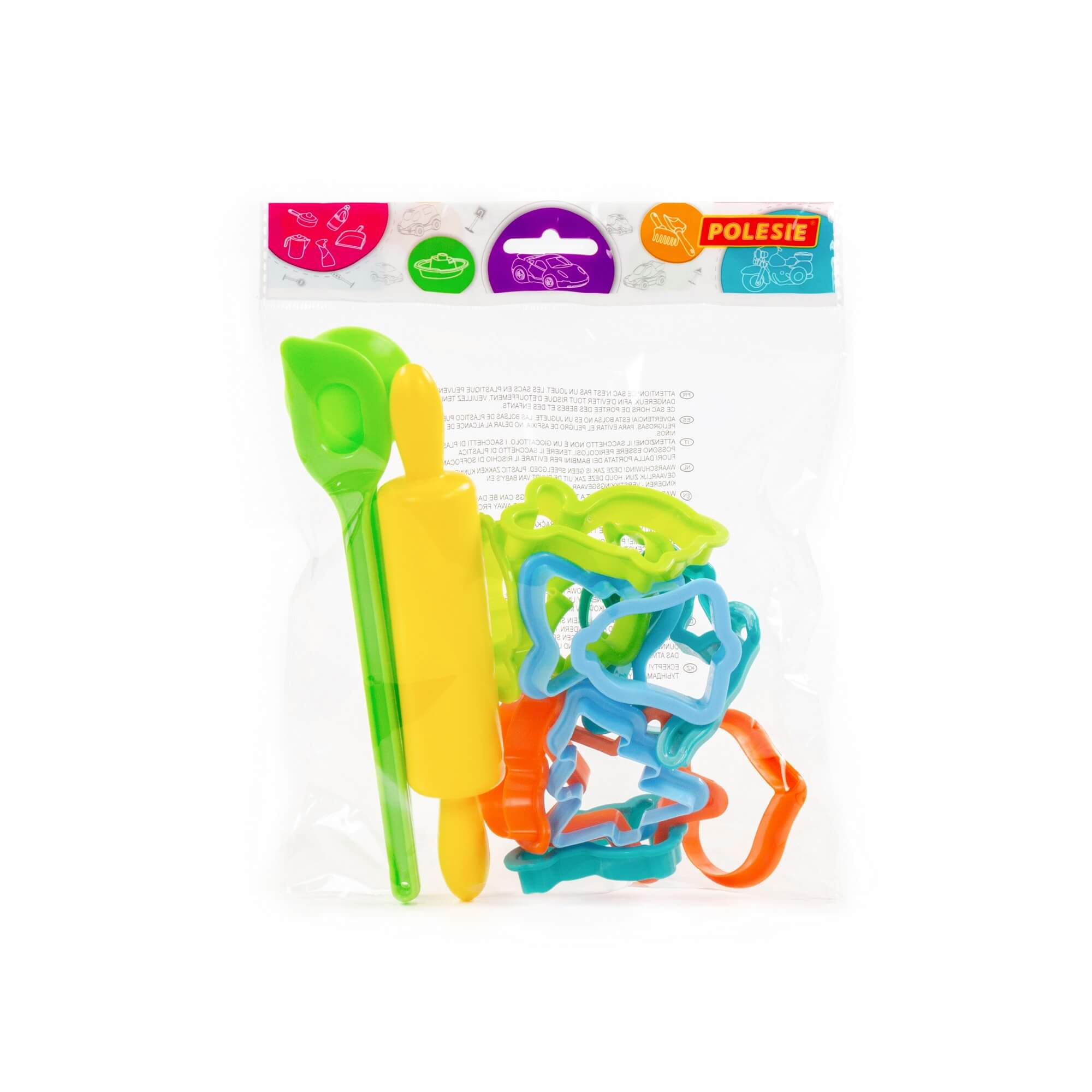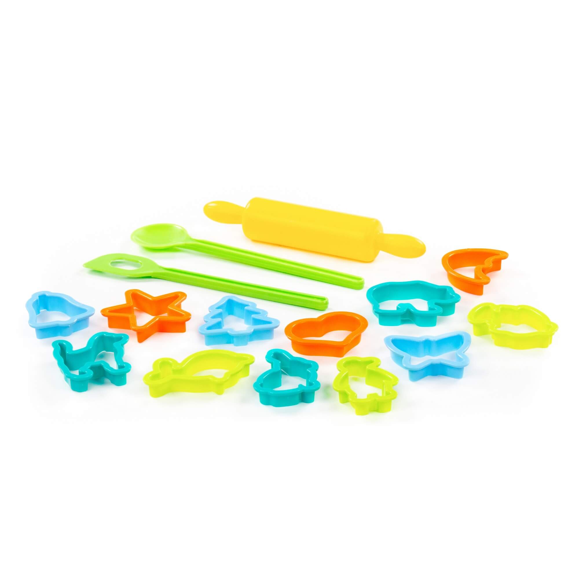 Večbarvni set vsebuje 20 kosov: valjar, modelčke in kuhalnici.