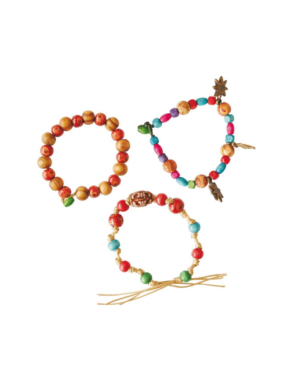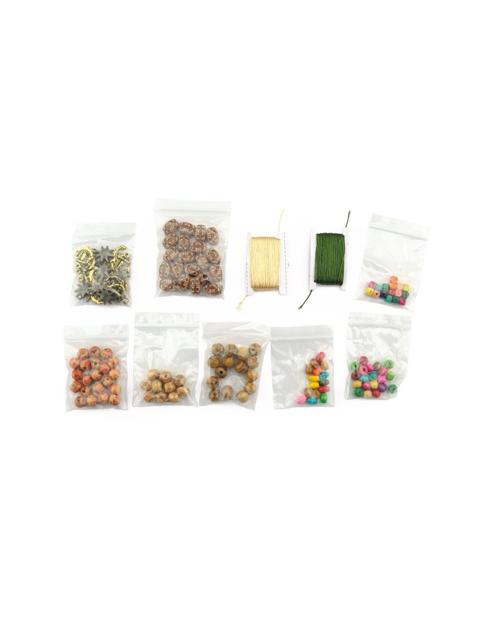 Komplet za izdelavo 7 zapestnic vsebuje: lesene perle, okrasne elemente, barvne niti.