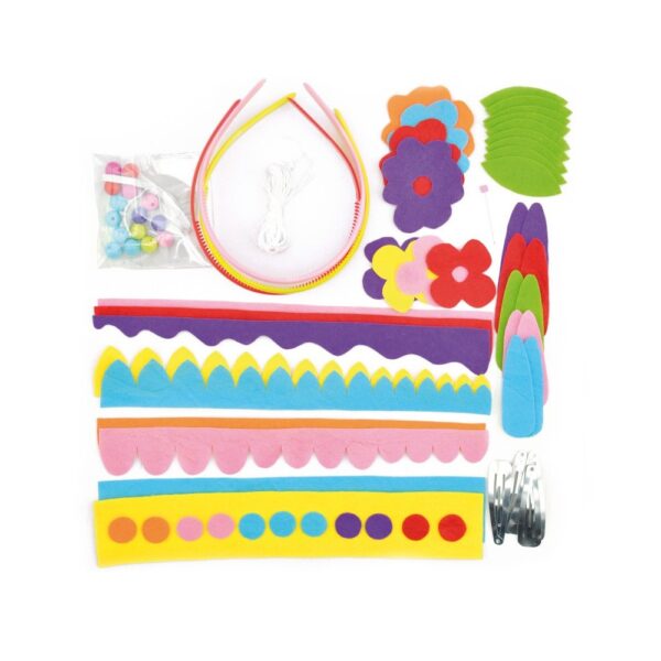 Vsebina: filc, naglavni obroči, trakovi, sponke, igla, nit, perle in elastični trak. Navodila za izdelavo so priložena izdelku.